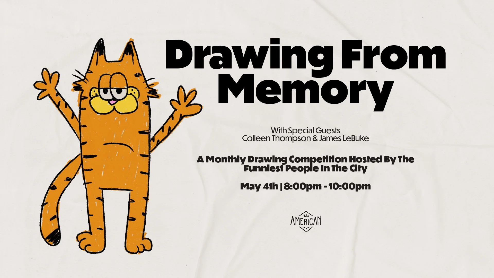 Introducing Drawing From Memory! Each month we’ll invite some of the funniest people in the city to host a drawing competition and ask you to draw things such as, but not limited to, your favourite cartoon character, significant cultural moments, album covers, and whatever else our hosts feel like throwing at you.