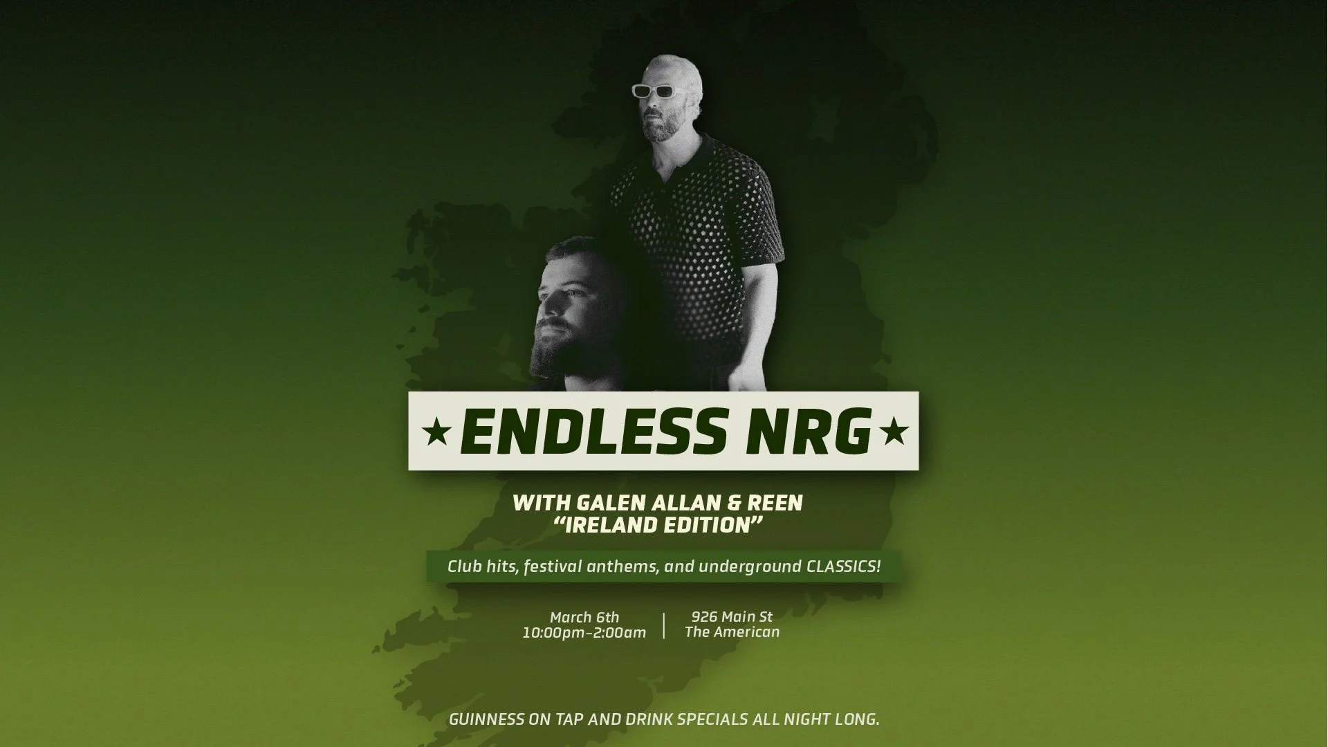 First up, IRELAND! Galen invited his good pal REEN from the legendary Jika Jika crew for this one and you’re all in for a treat. Expect big smiles, plenty of pints, and the finest club hits, underground classics, and festival anthems all night long.